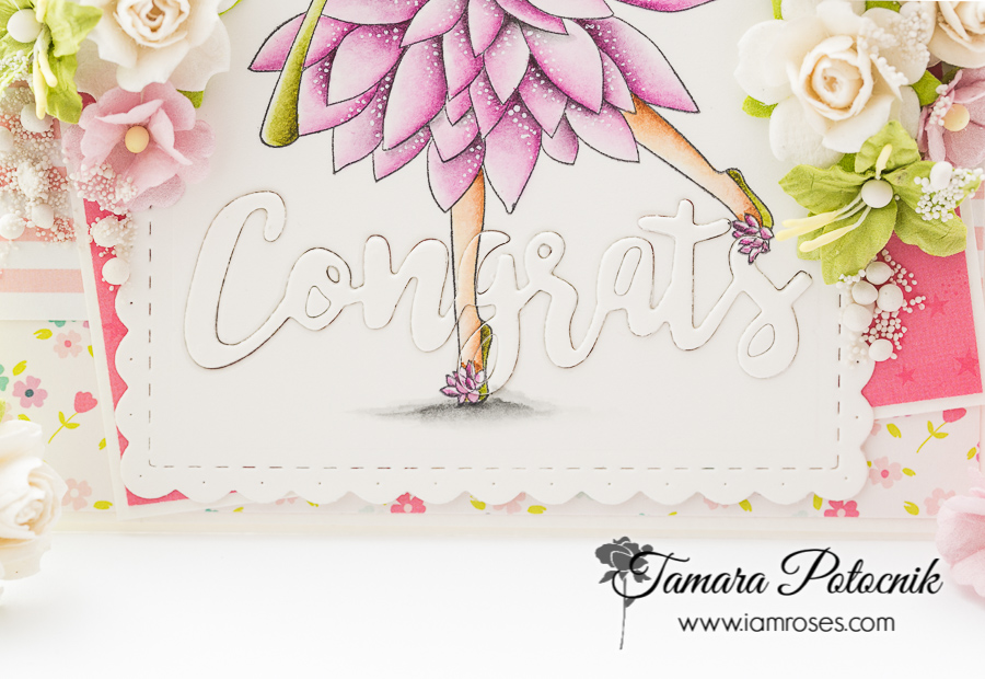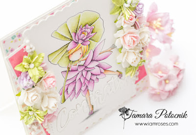 Tamara here with you. I have a super cute card for you today. It can be used for Congratulations of any kind. For this card I coloured one of Stamping Bella’s Garden Girls called Water Lily. Image was coloured with Distress ink pads.