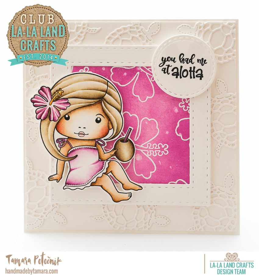 My first card features Tropical Marci, Hibiscus flower stamp and Honu die. I coloured Marci using Distress ink pads and then fussy cut her. I coloured my purple background using Seedles preserves distress oxide ink. Then I stamped my Hibiscus flowers and heat embossed them with white embossing powder.