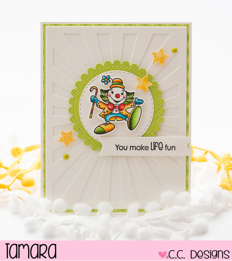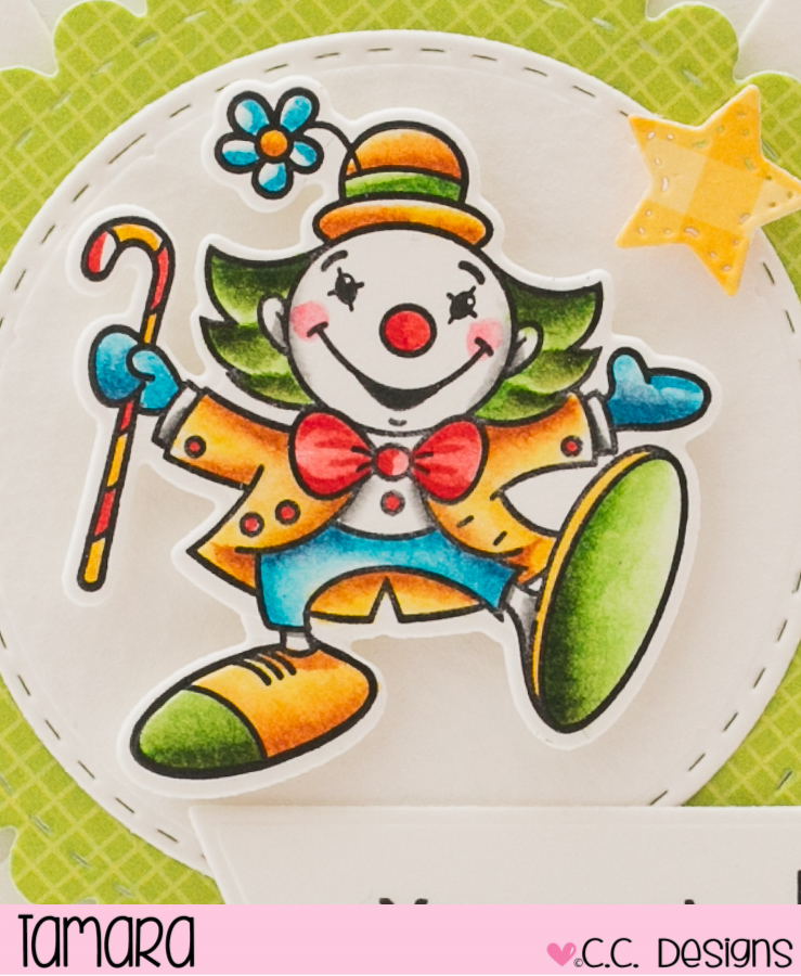 Today I’m showing you a card made with C.C. Designs’ new August release items. For this card I coloured up a clown from the Circus set. Image was coloured using Distress ink pads on Lnagton 300g HP watercolour paper.