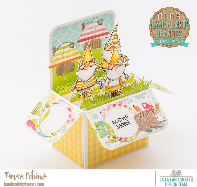 My first card features Sweet Gnomies stamp set. I made a box card and used all three gnomies and all three dies that come in this awesome kit.