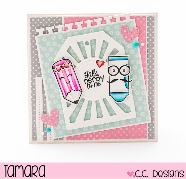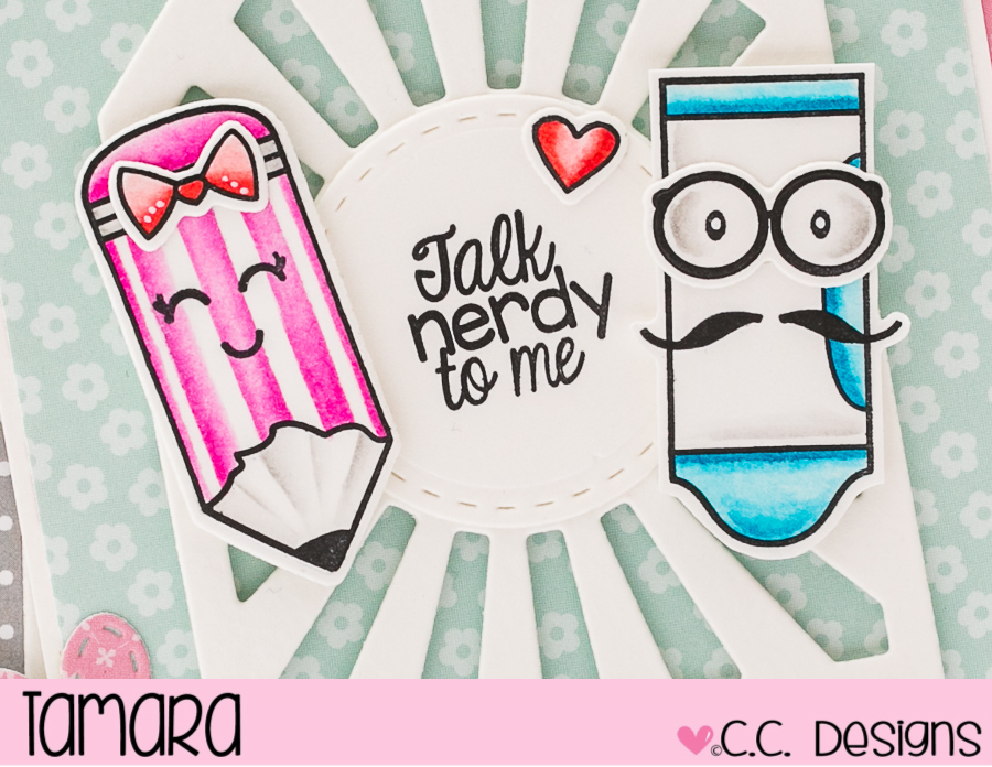 While I’m getting ready for the new release next week (wohoooo) I’m sharing with you this fun card that I made using August release. Images used are from a Nerdy clear stamp set. I coloured them up using Distress ink pads and then cut them out with outline dies.