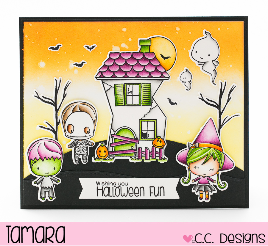 We have a lot of new things this month. They are all super cute and super fun! For my release day project I made a spooky card using images from 2 new sets (Hounted House & Trick or Treat clear stamp set). Images were coloured with Distress ink pads and cut out using new outline dies.