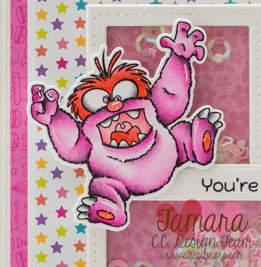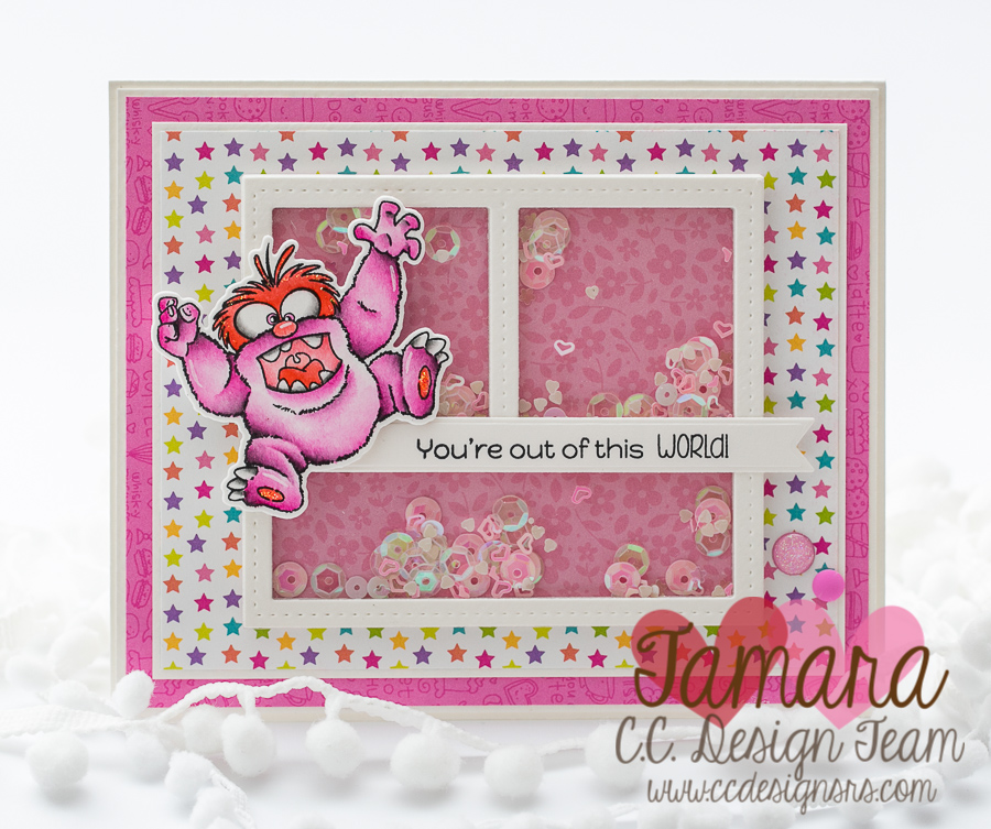 Today I’m sharing with you a girly monster card. I used one of the new images from C.C. designs and created a cute and very pink shaker card. The base for the shaker was made with the new Trio Collage Die.