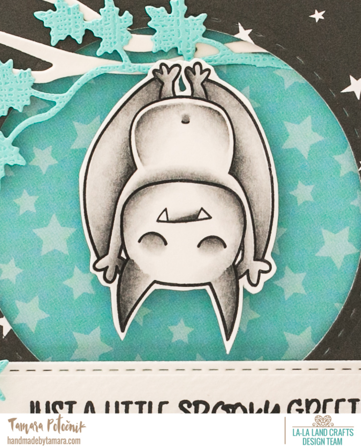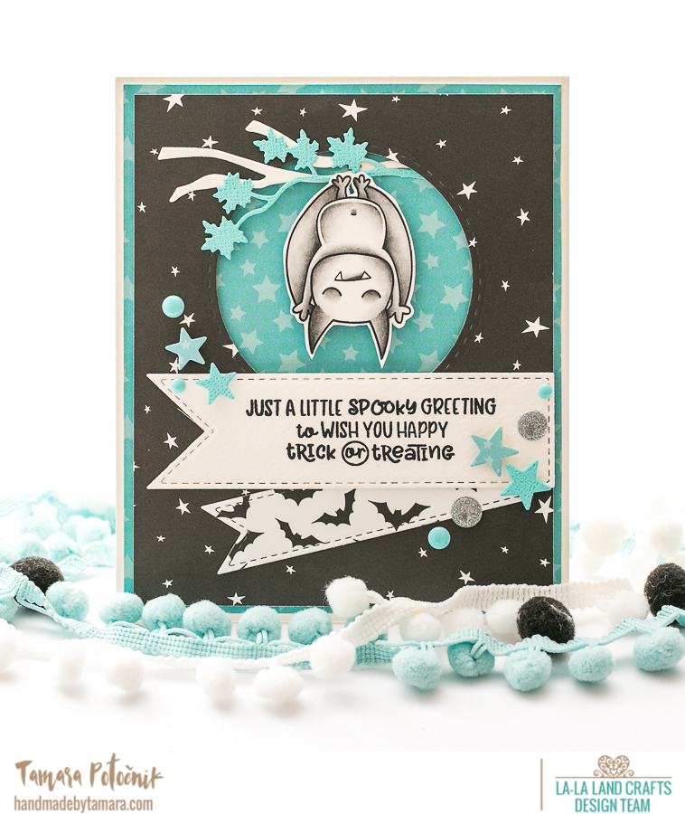 Today I’m sharing with you my Turquise & Black card for la-la land crafts. I decided to make my last Halloween card for this year. I coloured one of the super cute bats from Batty for You clear stamp set.