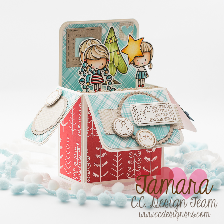 Tamara here with you. I made a box card using this adorable set from C.C. Designs called Christmas Time. Images were coloured using Distress ink pads and cut out using Outline dies.