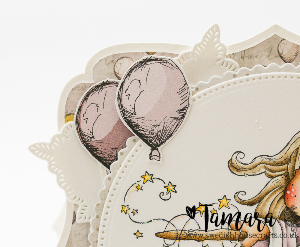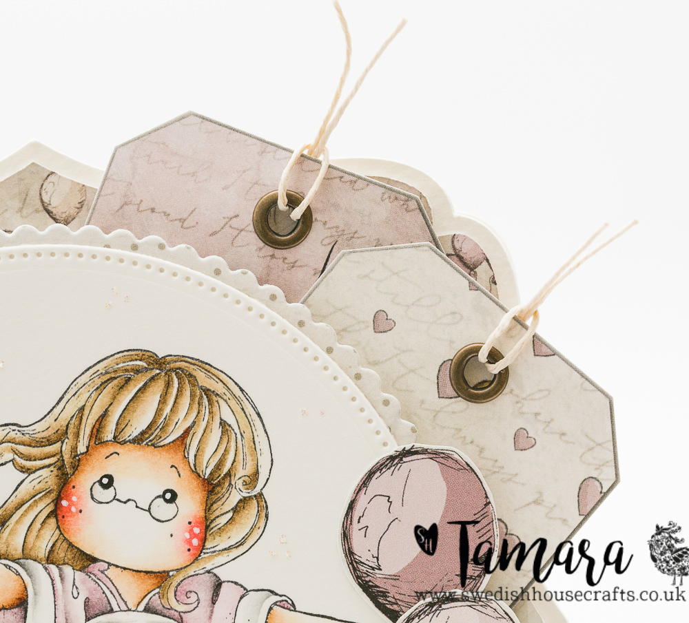 Even though those are baby papers they can be used for all sorts of cards. Laserowe Love papers come with a few stripes of double sided tags and other designs that you can cut out and from those I used balloons and the tags you see in the top right corner of my card.