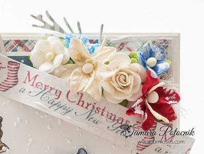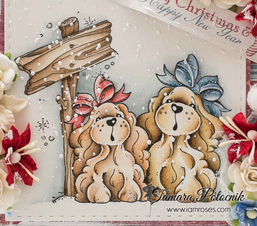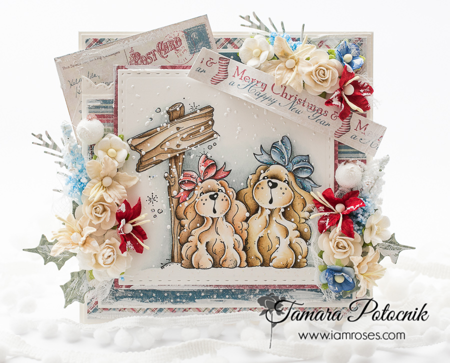Today I have a puppy Christmas card for you. I masked three Magnolia’s old images together and then covered them with white chunky embossing enamel to make it look like snow. Pretty papers used are from Maja Design.