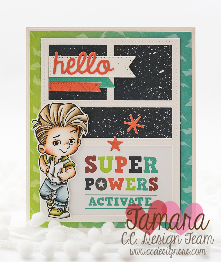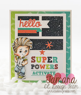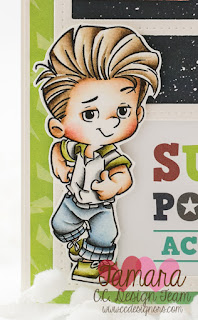 Tamara here with you. I made a masculine card using one of the new Rocker boys. Image was coloured using Distress ink pads.
