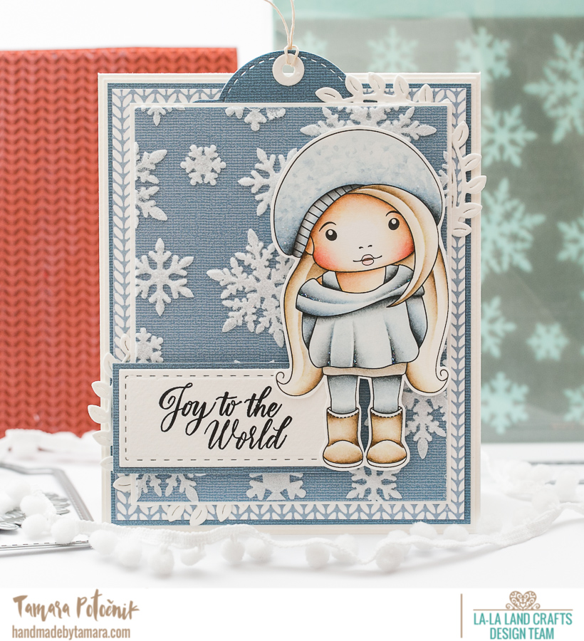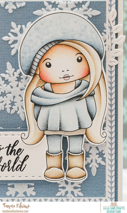 On my second New Release card I used Comfy sweater Marci. For the first card layer I used Sweater weather background stamp instead of design paper. For the second layer I used It’s snowing stencil, covered it with white paste and then covered it with clear glitter.