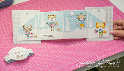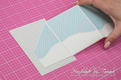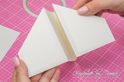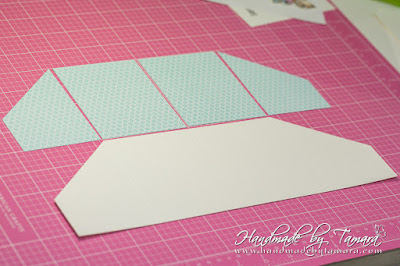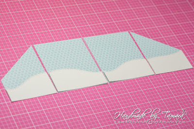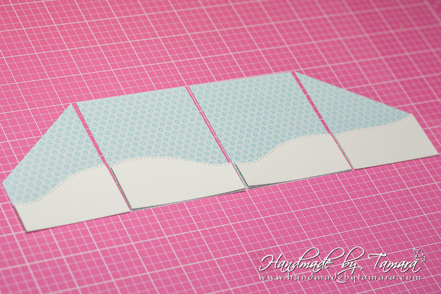 Cut one long white rectangle measuring 13,5″. You can asemble this one together from two smaller pieces. Then take your scoring board and make score lines at: 3 1/8″ – 6 3/4″ – 10 3/8″. As you can see on the picture the first square and the last one are cut. I cut them diagonally at 2 3/8″ on each side. This is the center piece of your accordion card.