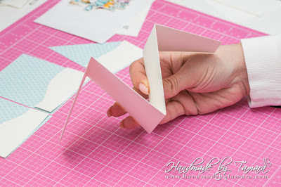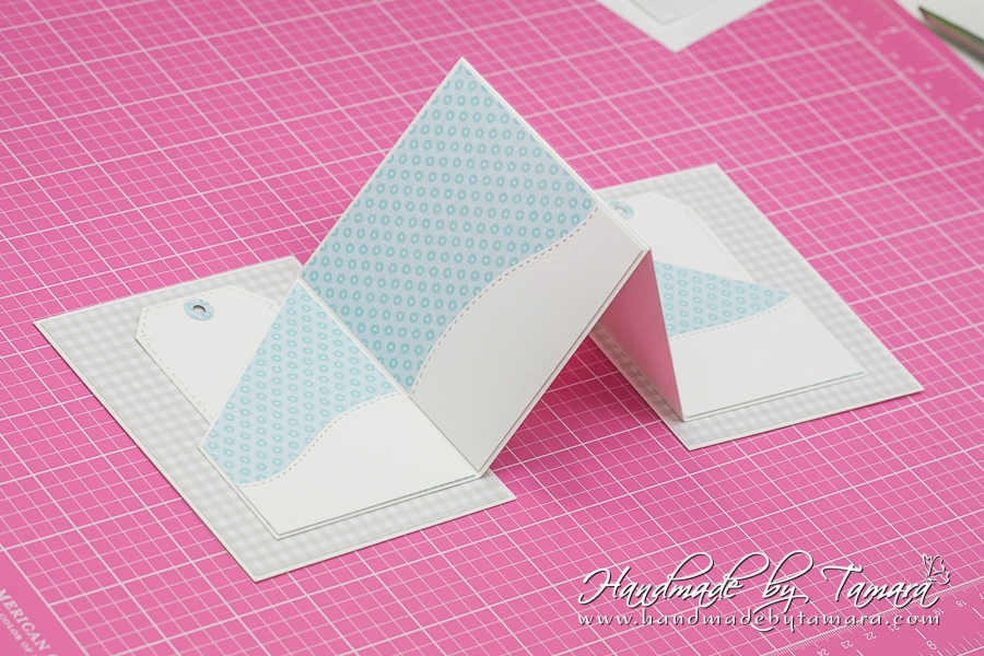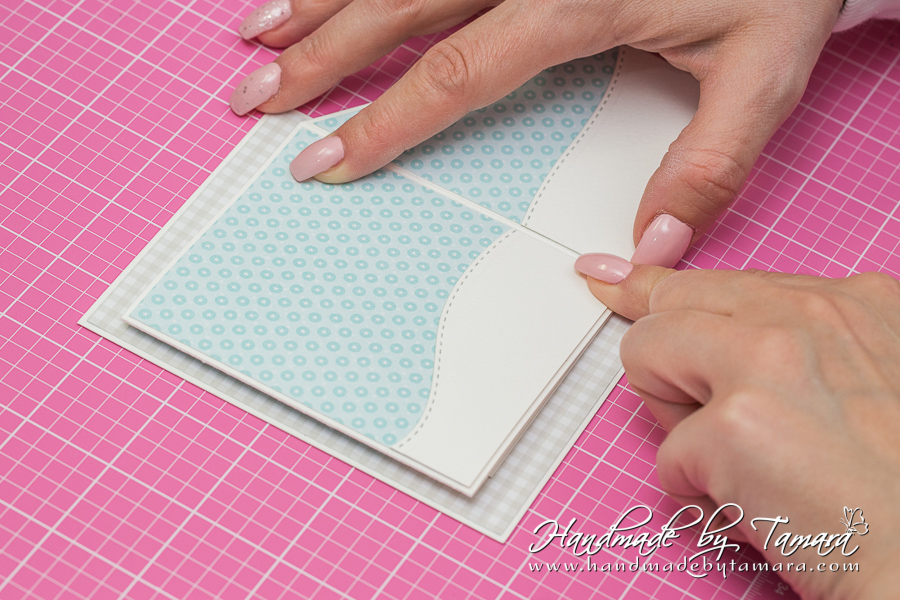 You already have 2 white cardstock rectangles from step 1, now you have to cut 3 rectangles from design paper. Two for the inside and one for the front of the card. Rectangles measure 3 7/8″ x 4 7/8″.
