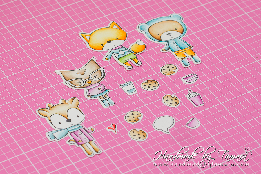 Colour in the chosen images. I decided to make a coffee and cookies forest party. heheh … Cut out images using outline dies.