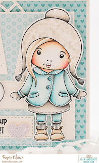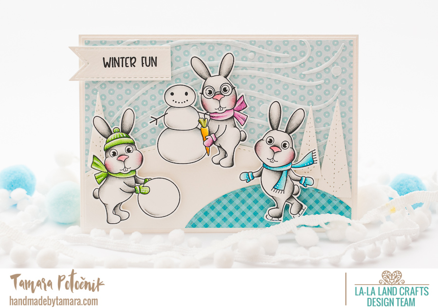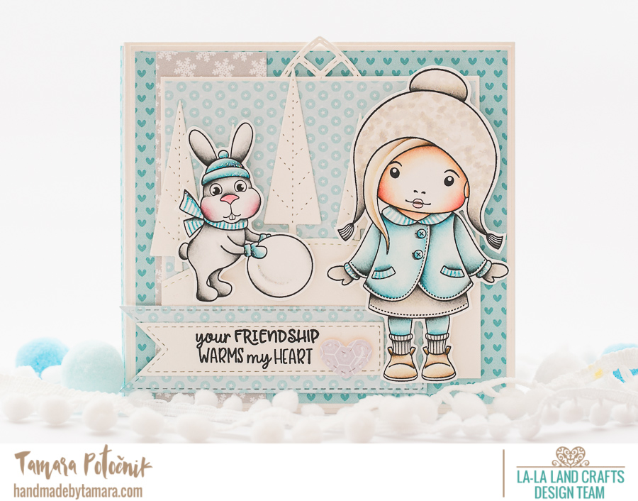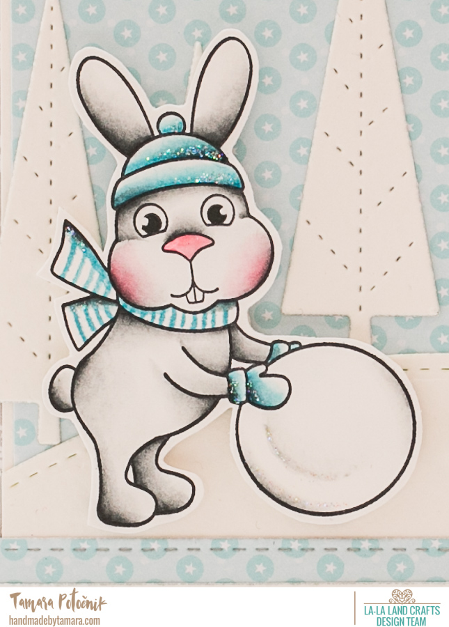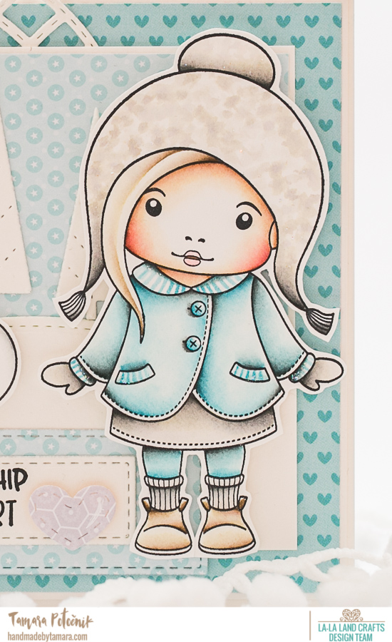 I used some pretty teal design paper for the background and added some details (aka wind) with one of LLLC stencils called It’s snowing.