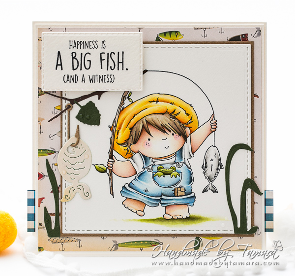 I added a few fishing themed die cuts around the image and I managed to find a design paper with fish baits (how cool is that, lol).