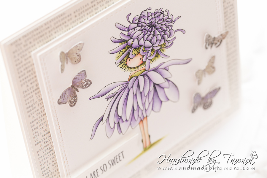 I didn’t want to add lots of embellishments since the image is awesome enough. I fussy cut a few butterflies from an old design paper and glued them around the image.