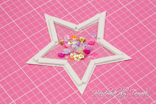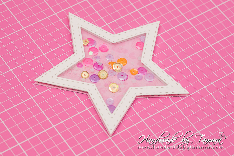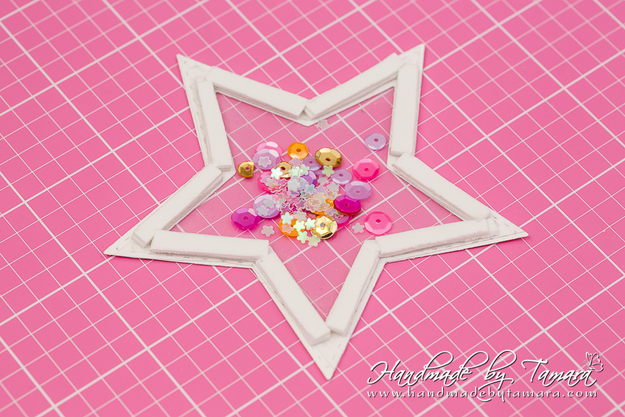 Add chosen shaker material (glitter, sequins, beads …) and cover it with the star cut from design paper.