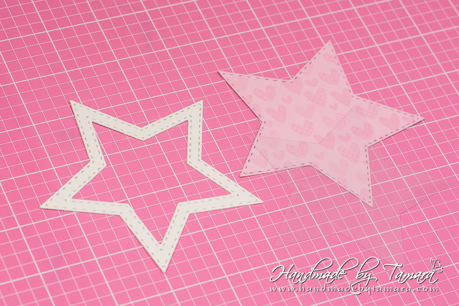 To make a shaker star you need to cut three stars. One from design paper, one from acetate and one from white cardstock. When you’re cutting the one from white cardstock you need to add the size smaller star in the middle and cut them together so you get a star frame.