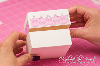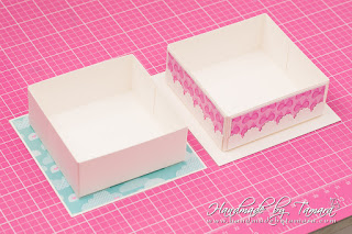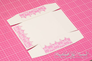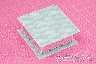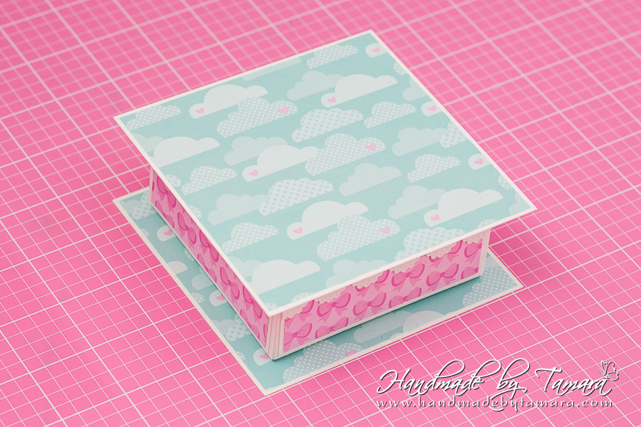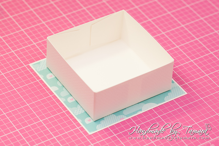 Glue the bottom of the box to the pattered side of the 4″x4″ square (you made it in the step 1). Bottom part must look up and you must see the design paper on the bottom piece.
