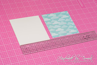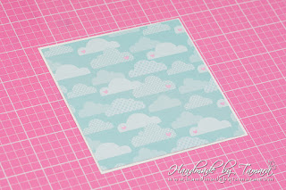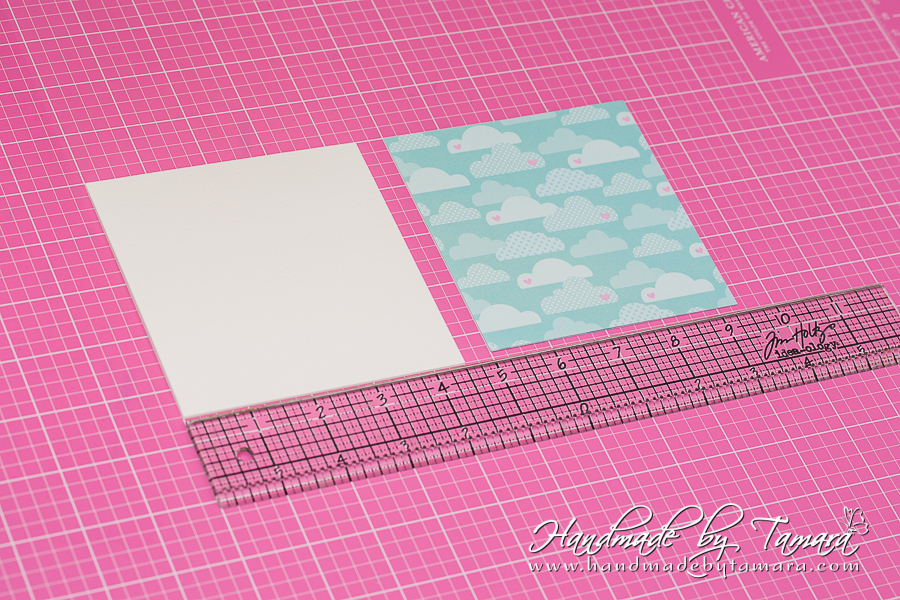 Cut two squares from white cardstock measuring 4.5″ x 4.5″ and then two squares from design paper measuring 4 3/8″ x 4 3/8″.