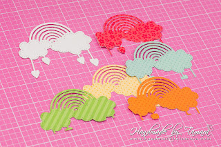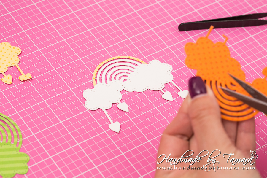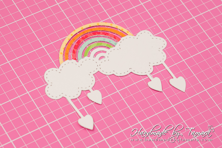 To make a colourful rainbow you need to cut a few different ones from design paper or you simply colour them with your inks.