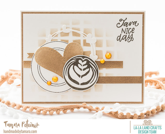 I made a very CAS Coffee themed card. I made the background with funky Squares stencil, I love the effect.