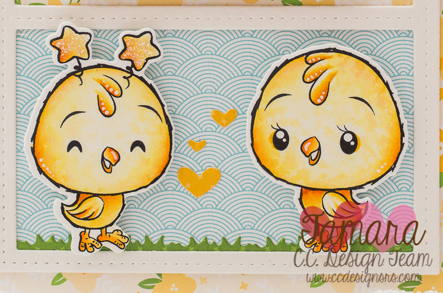 Tamara here with you. I made a card using Cute Birds clear stamp set. Images were coloured using Distress ink pads on watercolour paper and then cut out with matching outline dies.