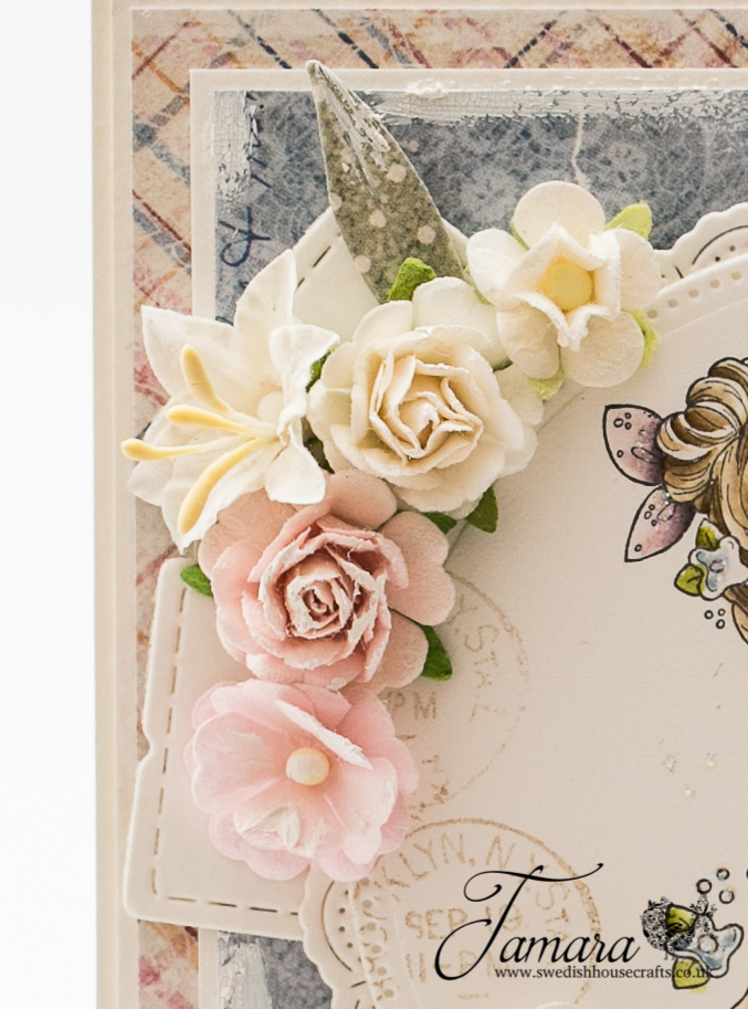 Tamara here with you today. I made a sweet girly card using Tilda with clogs from Magnolia’s Country Girl collection. Image was coloured up using Distress inks on watercolour paper. I stamped a few post mark images around the center image.