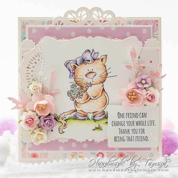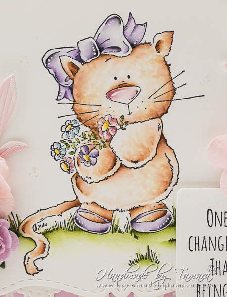 Those of you who know me personaly know that I absolutely loveeeee cats. I’ve always had cats and curently I have a 1 year old ginger named Roxy. I colour almost all cat images orange. hehe … For today’s card I chose one of the stuffies called Marmalade the kitty.