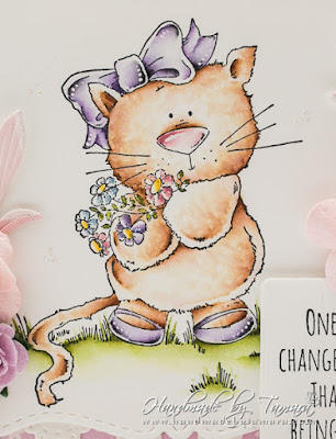 Image was coloured using Distress ink pads on 300g HP watercolour paper. I added lots of die cuts and paper flowers to embellish my card.