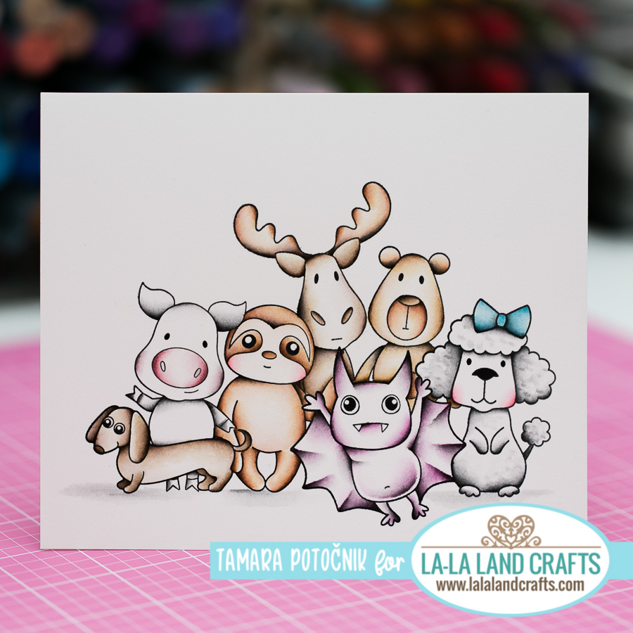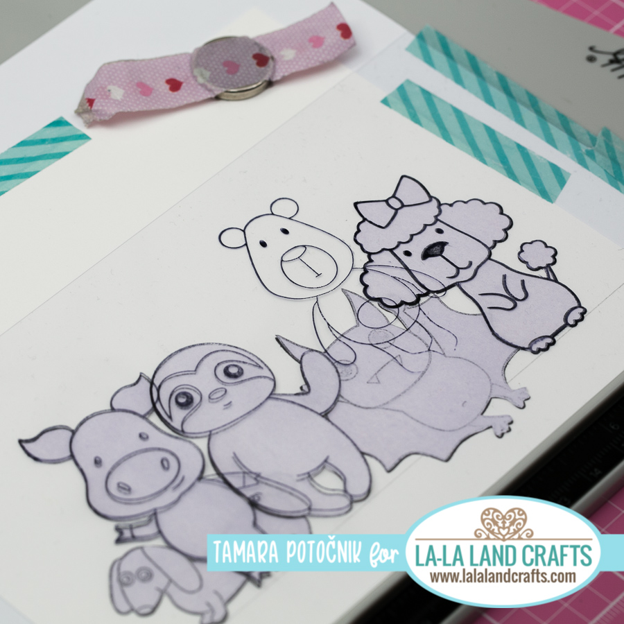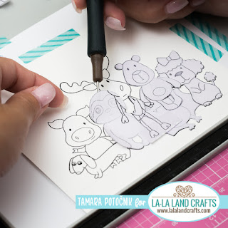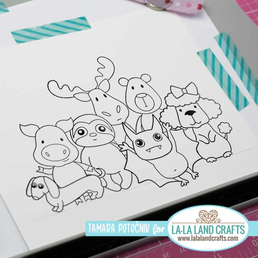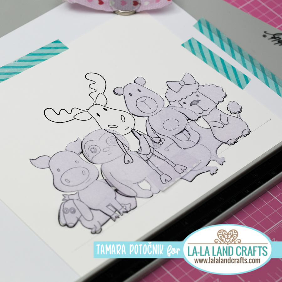 Tamara here with you. Have you seen the amazing 5th anniversary CLUB kit from la-la land crafts??? It’s amazing and there’s one big stamp of la-la land animals. I decided to show you how to create a similar scene with masking images. It’s super easy, you’ll see.
