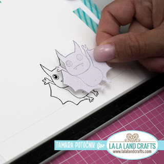 Bat is the image that we’re stamping first since it’s in the front of our masked image. After it’s stamped cover it with the fussy cut image.