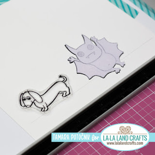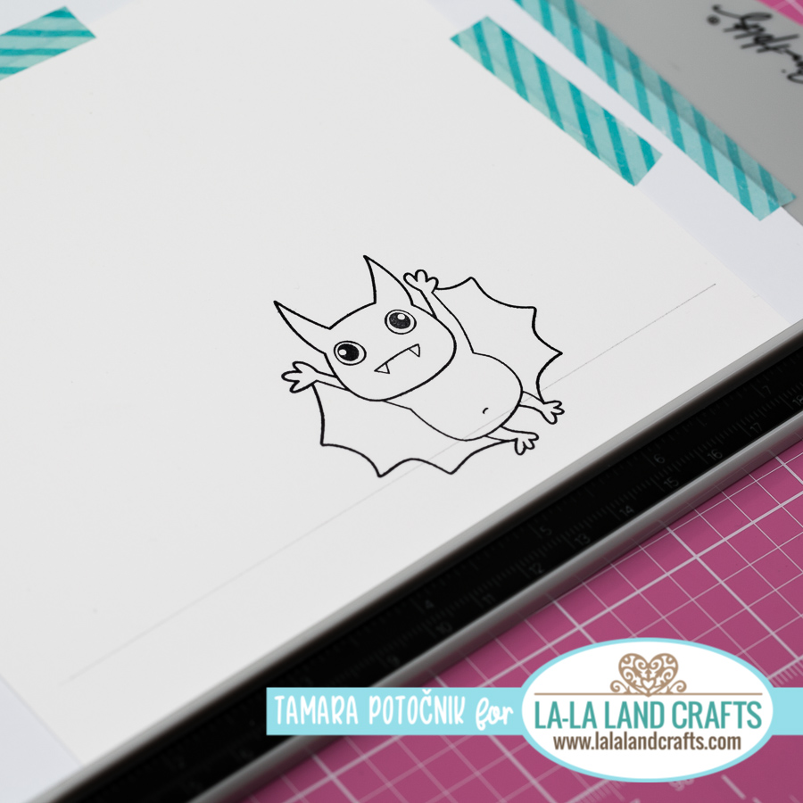 Take your ruller and draw a thin line just a bit above the bottom of the paper. That’s where the animals will be lined up. Bat image is stamped a bit lower so leave enough space on the bottom.