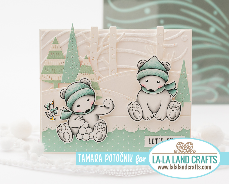 This week’s theme at la-la land crafts is MONOCHROMATIC. I decided to use shades of teal on my card. I coloured two cute bears playing in the snow and a little birdie.