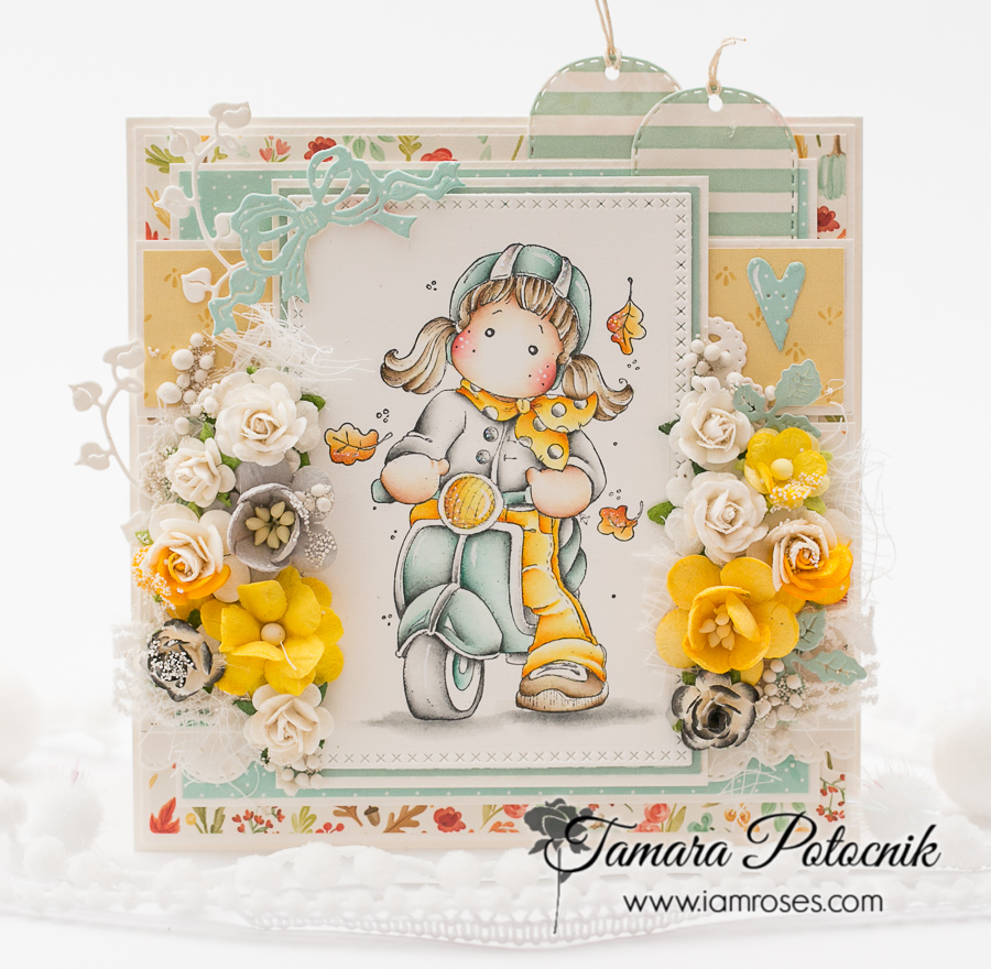 Today I’m sharing with you a Fall card using teal, cream, grey and white flowers. This Magnolia’s image is one of my favourite and I really like colouring it. Papers used are new Fall papers from Carta Bella. I decorated the card using lots of pretty I am roses flowers.
