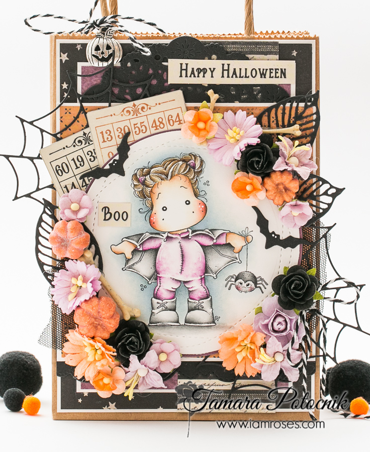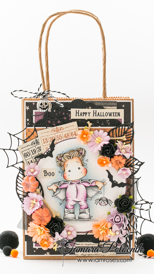 For this month’s challenge I made a Spooky gift bag. I recently got this lovely image and had to use it right away. I added lots of embellishments on this one: flowers, die cuts, metal charm, twine, lace, glitter …