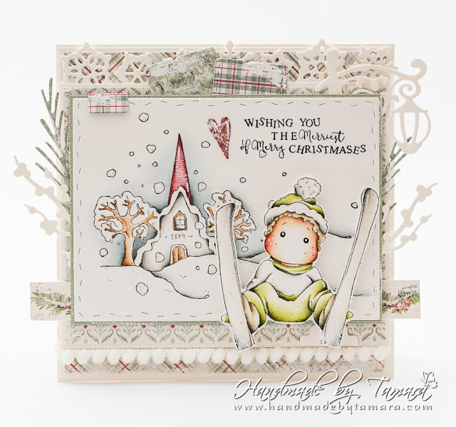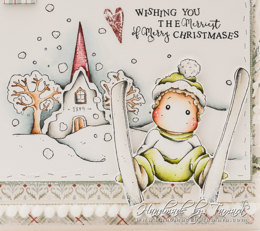 Today I’m sharing with you a Christmas card. I used two of my old Magnolia images (Ski Edwin With Snowflakes & Old Swedish church – A Christmas story 2012). I didn’t masked them together because I wanted to create some dimension.