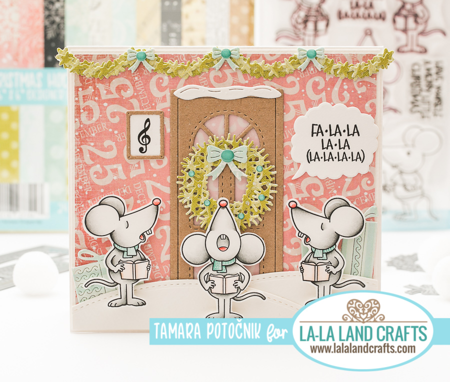 I made a Christmas card using cute mice from A Caroling we Go clear stamp set.