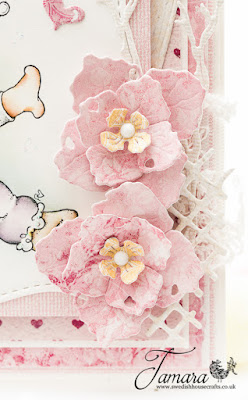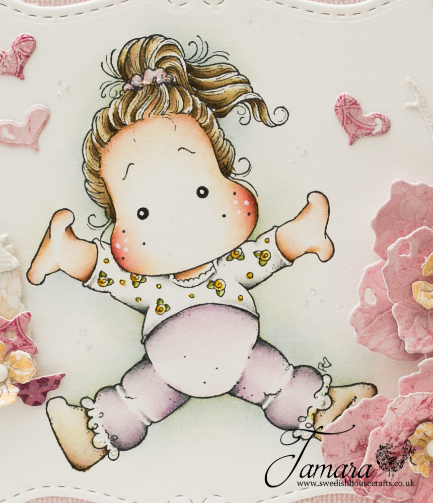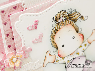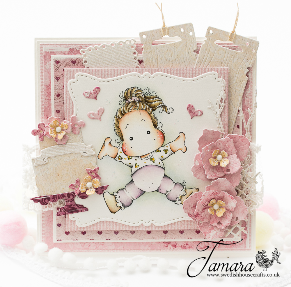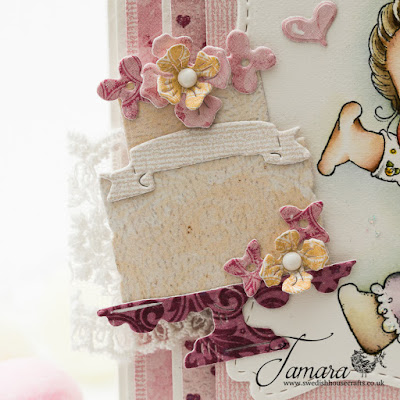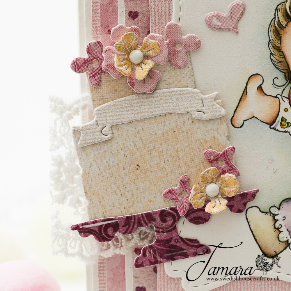 Tamara here with you. I love playing with the new Christmas calendar kit stamps and dies. I used one of the new images on this card, together with the cake die and tags from the same kit. Image was coloured up using Distress ink pads.