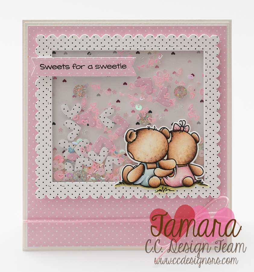Today I’m sharing with you my second card made with the new release from C.C. Designs. It’s a shaker card featuring super adorable bears from Lots of Love clear stamp set. Image was coloured up using Distress ink pads and then cut out with matching outline dies.