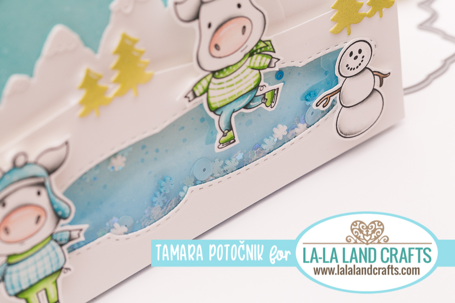 First card is a shaker card. I used Lake die to create the shaker part. I coloured everything with my Distress oxide inks. I added some showflakes on the background, made with Snowy Hills Layering Stencil and covered with glitter.