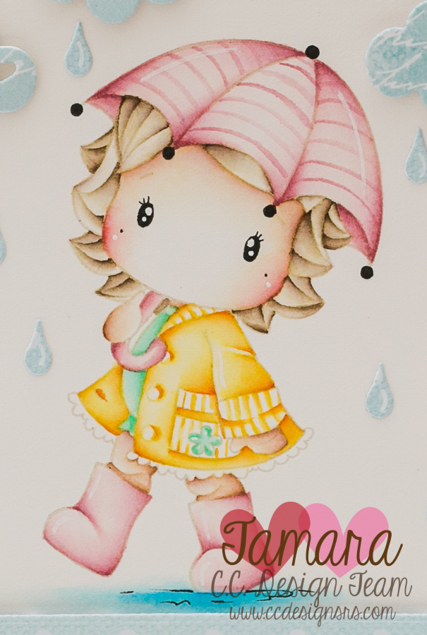 Today I’m sharing with you a card made for C.C. Designs Release day 2. I coloured one of the new Swissies called Umbrella Swissie. Loveeeeeeeeeee her … you knew that, Right?!
