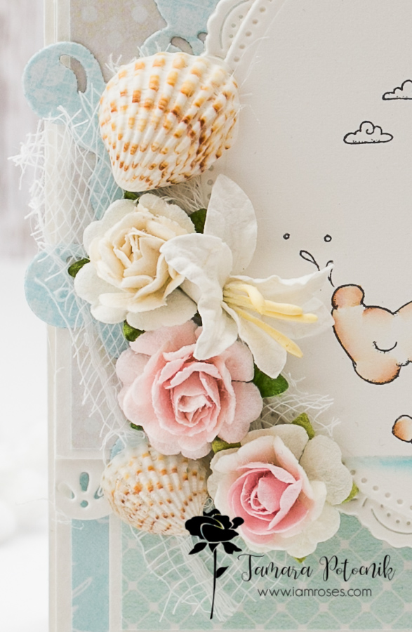 For this month’s challenge I made a Sea themed card. I used one of my older Magnolia images and coloured it using Distress ink pads on 300g HP watercolour paper. I decorated my card using lots of pretty I am roses flowers.
