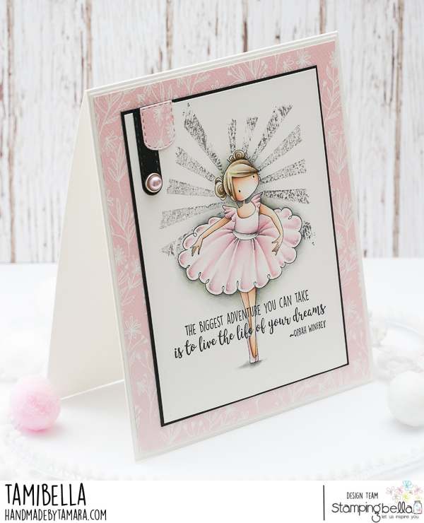 Tamara here with you. When I was going through my Stamping Bella stamps I realised I haven’t used quite a few of my Christmas stamps. It’s a bit eary to start on Christmas cards so I decided to use one of the Christmas images on a basic card. I stamped Tiny Townie Natalie from Tiny Townie NATALIE and the NUTCRACKER stamp set and coloured her up without using the Nutcracker too. This way she can be used for girl’s cards and not just Christmas.