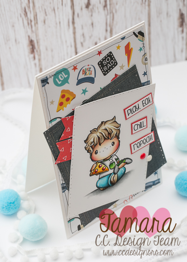 Design papers used are from Echo Paer and Simple Stories (jeans pattern). Sentiment PLAY. EAT. CHILL. REPEAT. comes with the image.