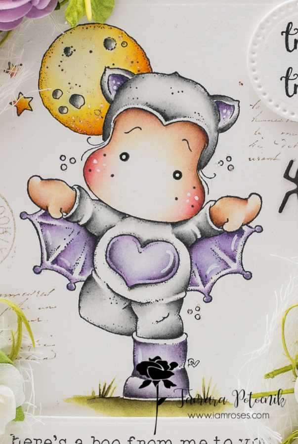 Butttt … I managed to put this one on paper. It’s from Quarantine set and I loooove it. I masked together two images: moon and Bat Tilda. Even before starting with the colouring I knew which I am roses flowers I’m using. The bright orange mini lilies are to die for!!! Such an amazing colour, love it!