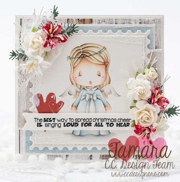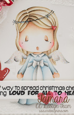 Today I’m sharing with you a card made for C. C. Designs. Image is called Singing Angel Swissie and it’s from the latest release. I coloured her in no-lines technique using my Distress Ink pads. Design papers used on this image are from P13 and these are actually from a Summer collection.