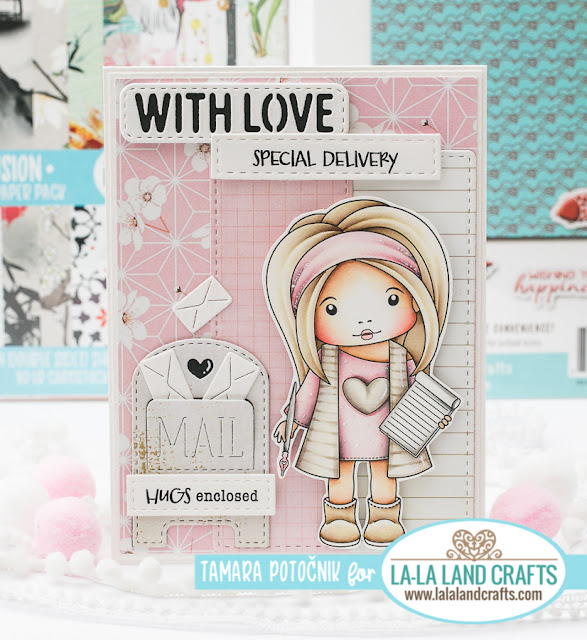 This week’s theme for the la-la land crafts challenge is (still) USE New Release. On this week’s card I used Marci with Pen. This image was part of the January 2020 Club Kit and she’s awesome!!! I coloured her in pink and stone-grey because I wanted her to match the pretty new LLLC papers called Asian Fusion.