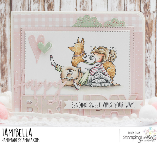Tamara here with you. Today I have a Birthday card for you. I bought this stamp quite some time ago but I was terrified of colouring those dogs. I can do cats but dogs?? I finally decided it’s time to do it and honestly it was so much fun. Ok, I know that the biggest dog kind of looks like a poodle. LOL