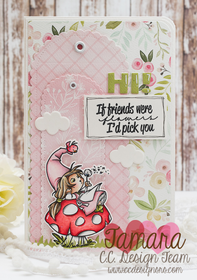 Hi and Welcome to C. C. Designs Preview Day 2!!! We have an awesome Gnomy release for you this month. hehe … Stamp set used on my card today is called Gnome Friends. I chose one of girly images for my card.