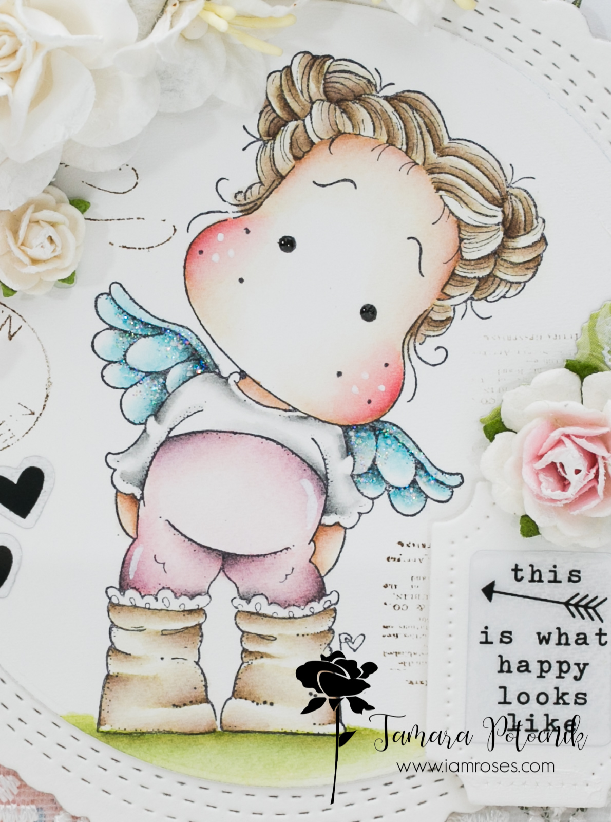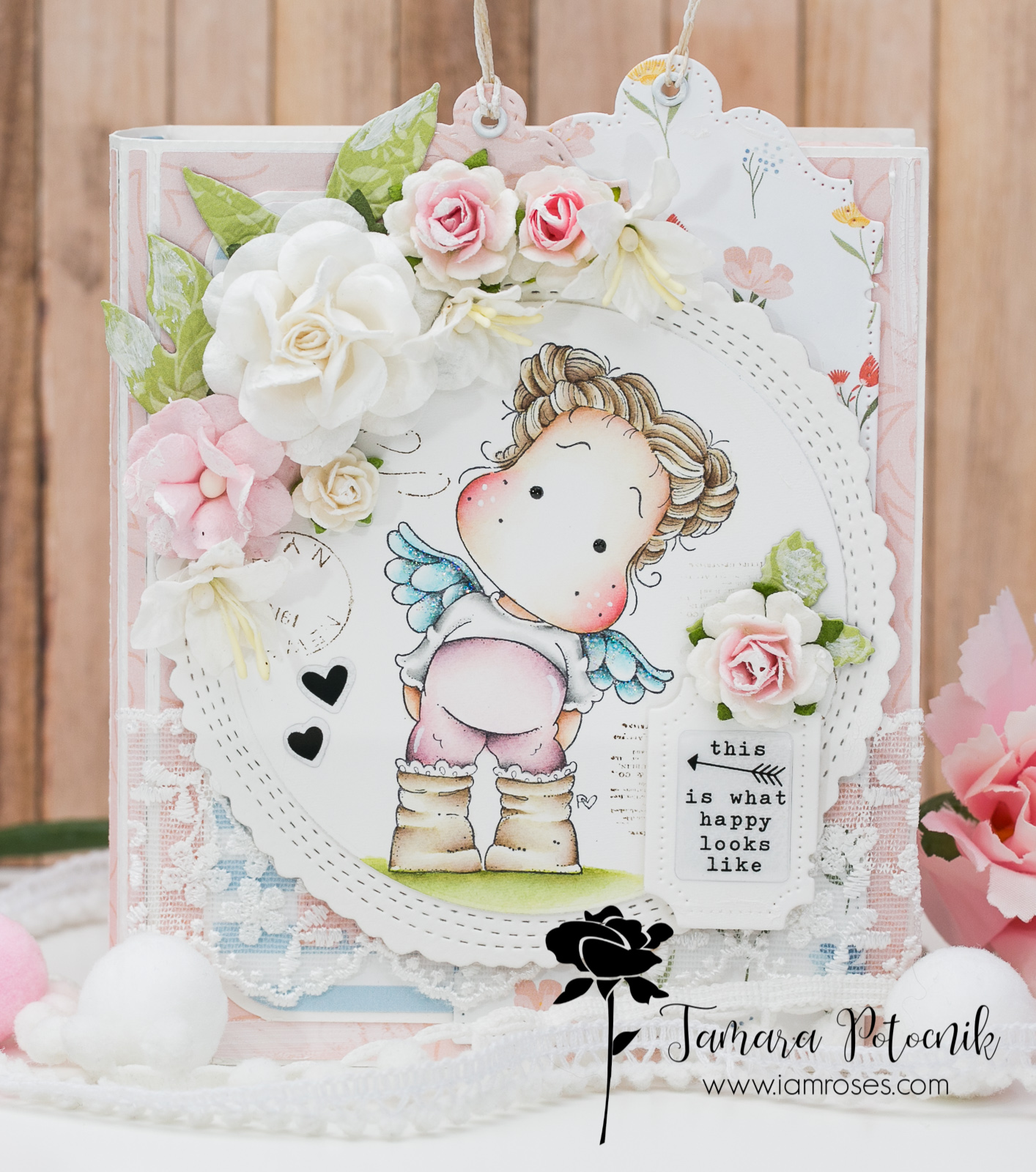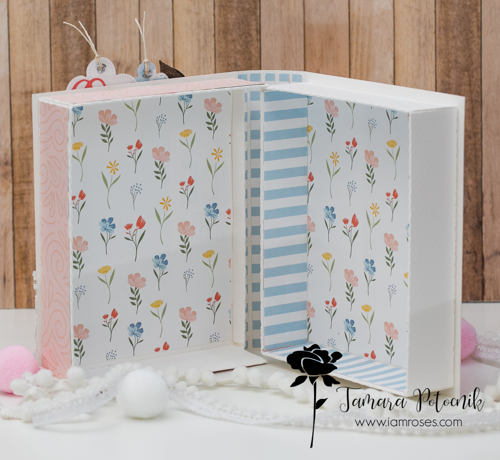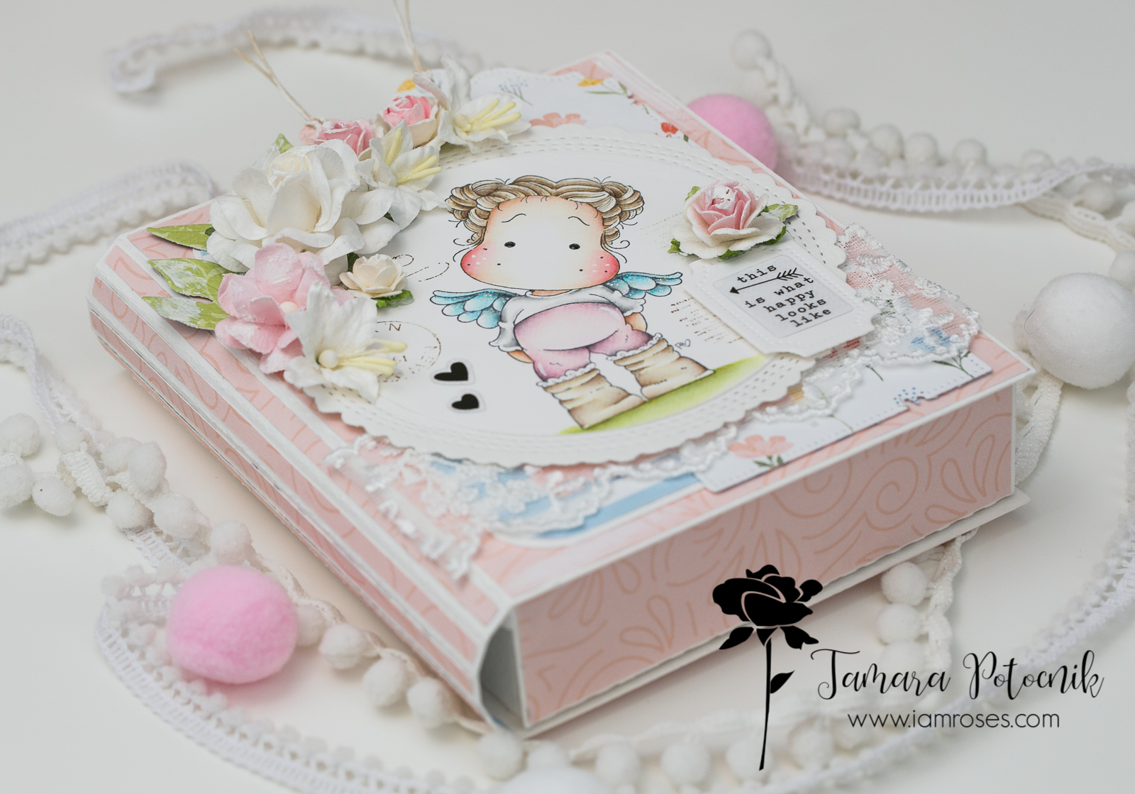For this month’s challenge I made a gift box. I decorated the front and the inside, using pretty papers, Magnolia image and a gorgeous I am roses flowers!!!